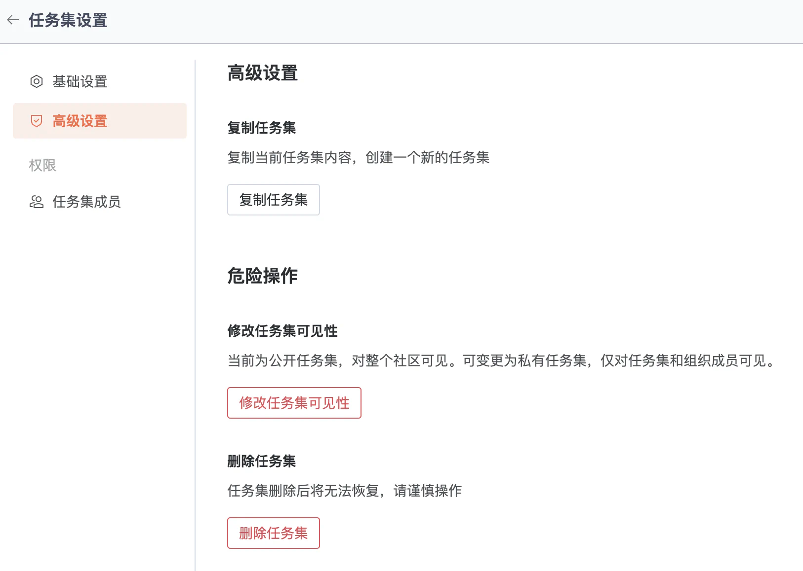 :::tip 修改任务集可见性会影响任务集的访问范围,删除任务集后数据无法恢复,需谨慎操作。 :::