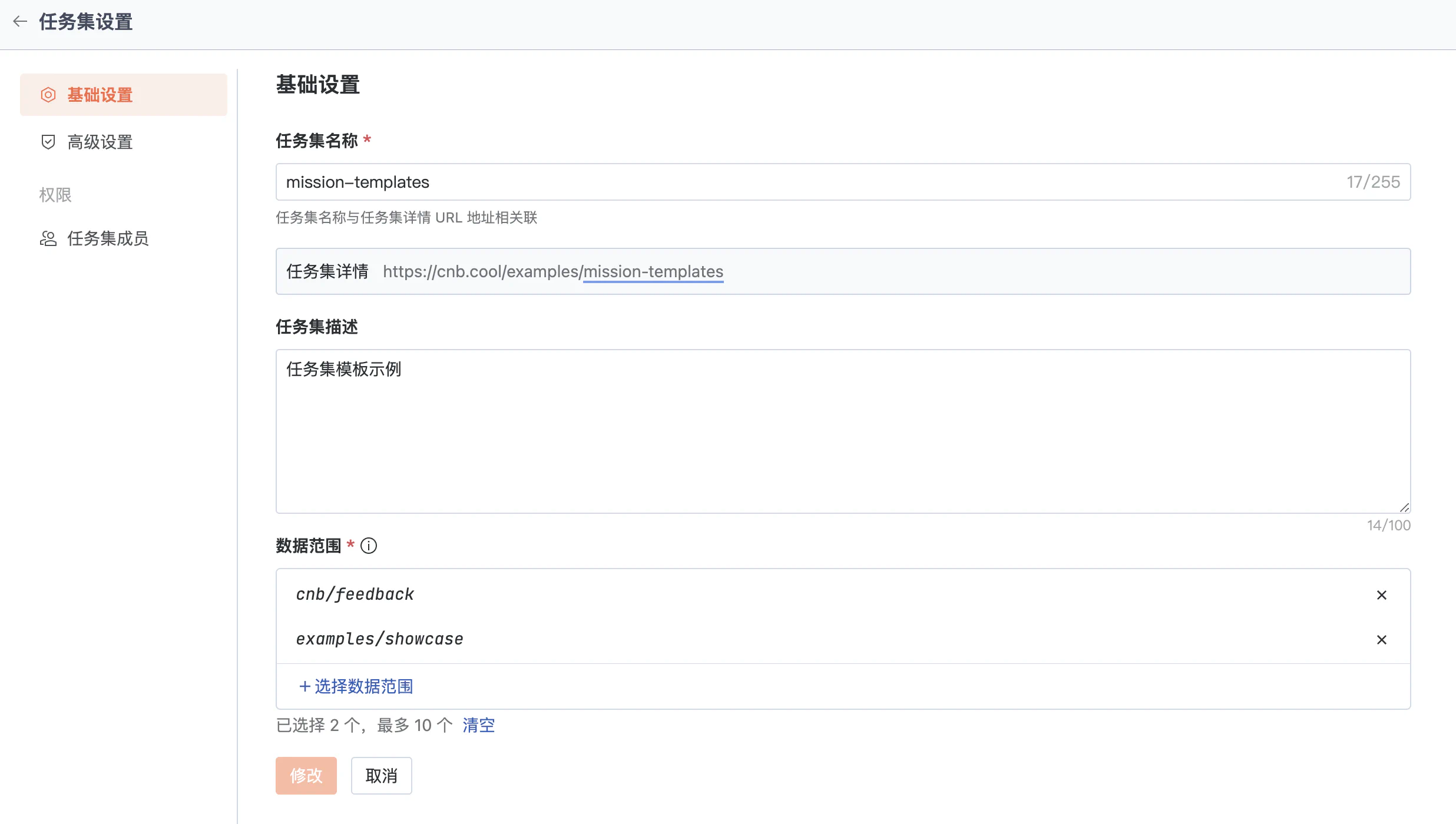 可以修改任务集名称和编辑任务集的数据范围等任务集的基础信息。