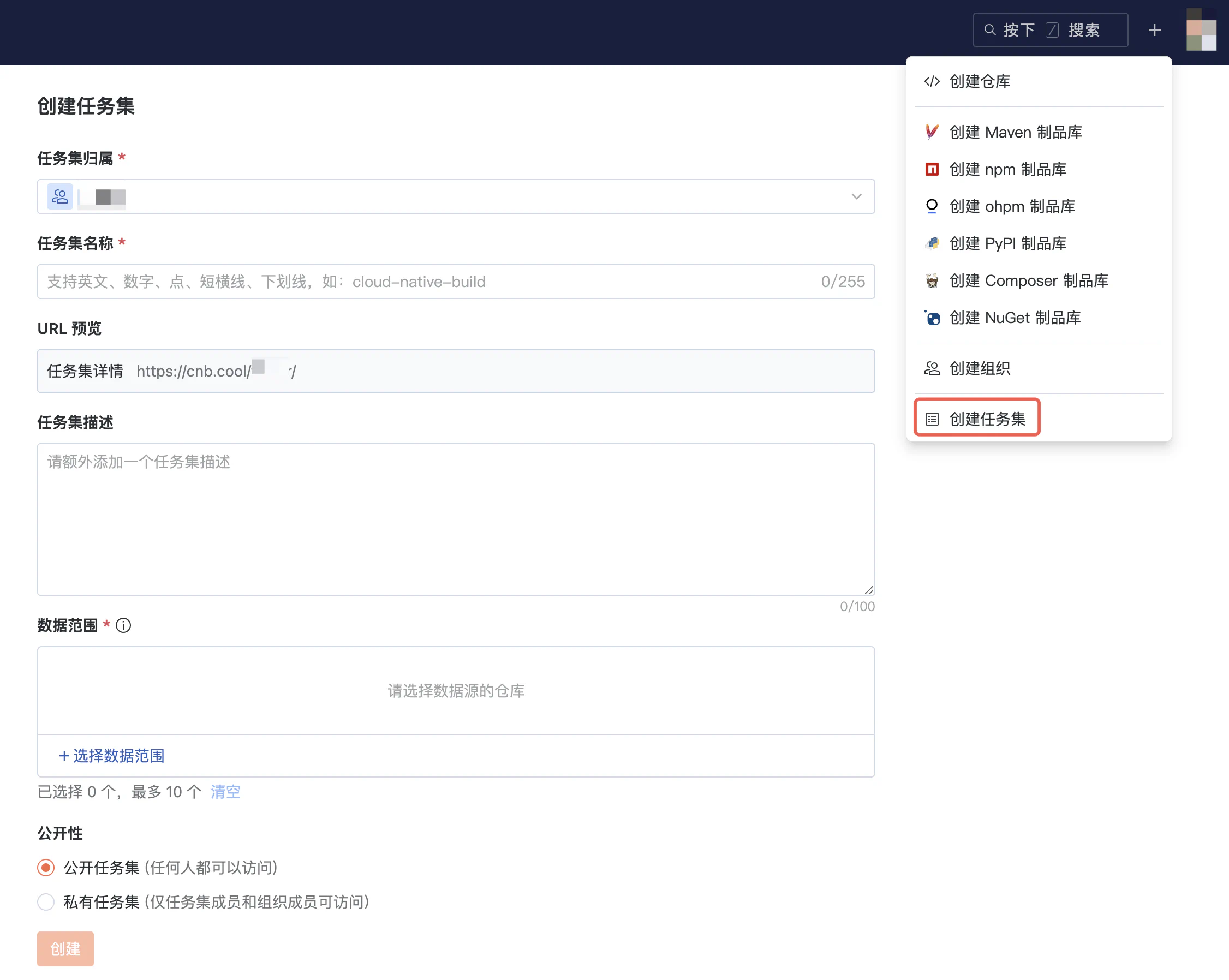进入 CNB,单击右上角的“+”,选择 创建任务集;